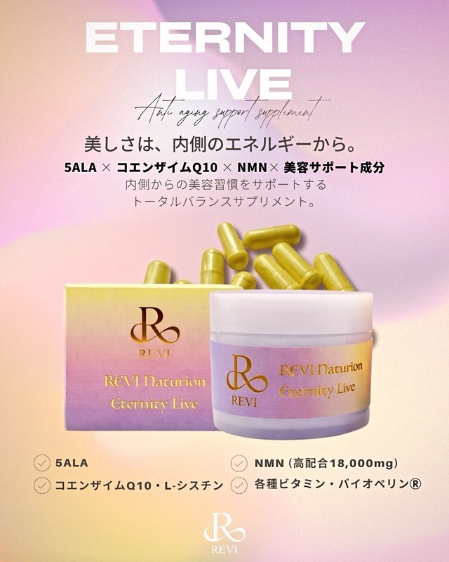 「REVIナチュリオン エタニティライブ」 単なる栄養補給ではなく、 「加齢とともに低下する細胞エネルギー」に着目し、健康寿命・若々しさを内側から支えることを目的に開発されたサプリメントです。 ──────────────── ■ エタニティライブの特徴 ──────────────── 【① 5-ALA配合】 人体のエネルギー産生に不可欠なミトコンドリア機能に関与し、 ATP(細胞エネルギー)産生をサポートする重要成分。 【② 高配合NMN(18,000mg)】 国産NMNを高配合し、エネルギー産生や細胞の若々しさ維持をサポートします。 【③ 5-ALA × NMN の相乗効果】 エネルギーを生み出す土台を整えながら、 代謝・修復システムへ同時にアプローチ。 【④ その他サポート成分】 コエンザイムQ10 / L-シスチン / 各種ビタミン / バイオペリン® などを配合し、 美容・健康の両面からサポートします。 ──────────────── ■ 商品概要 ──────────────── ・内容量:330mg(ハードカプセル)×90粒/45日分 ・目安量:1日2粒程度 「REVIナチュリオン エタニティライブ」 定価:25,000円(8%税別)